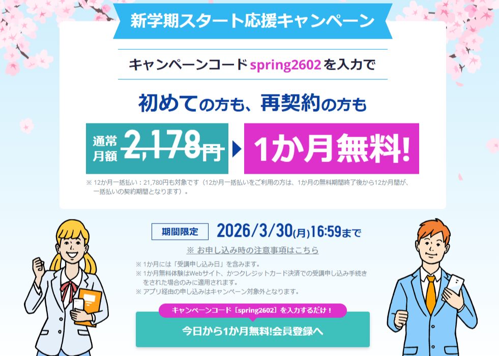 スタディサプリの利用開始時に、キャンペーンコード【spiring2602】を入力すると、初めての方・再契約の方ともに1か月無料で利用できるクーポンが発行されます。(※クレジットカード決済のみ)