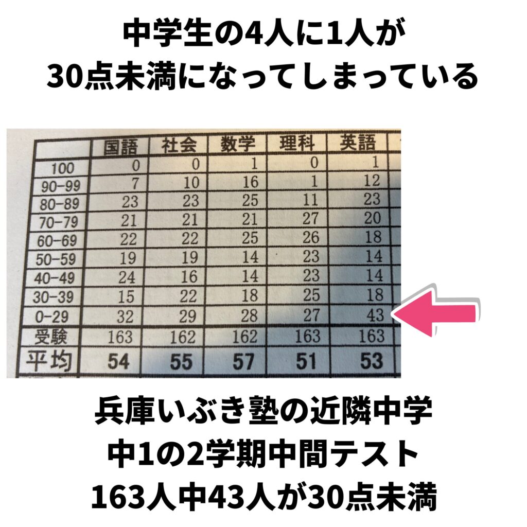 兵庫いぶき塾の近隣中学校でも、中1の2学期中間テストで学年の4分の1の中学生が英語30点未満を取ってしまう事態に。