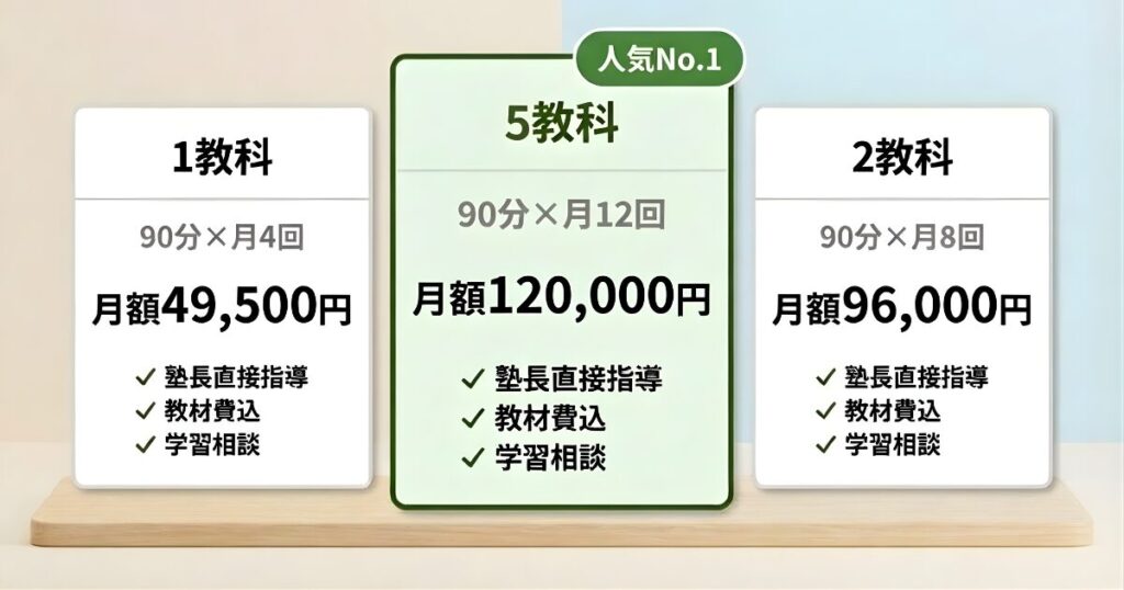 | 5教科コース (人気No.1) | 90分×月12回 | 120,000円 | 塾長直接指導 教材費込 学習相談 | 受験に向けて総合的に学力を上げたい方 |