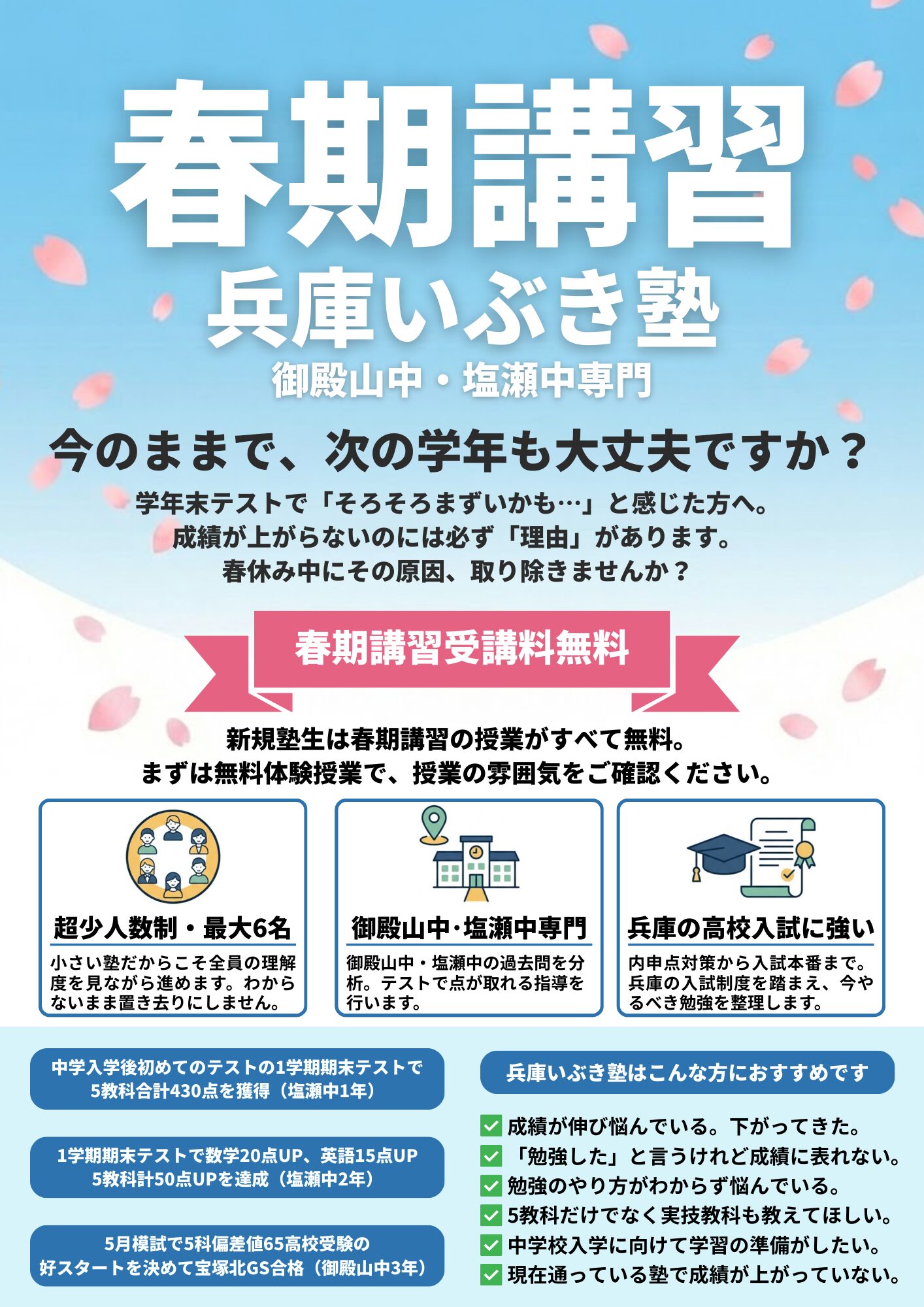 「新年度こそ成績を変えたい」という思いを持っている方は、ぜひこの機会に、兵庫いぶき塾の春期講習をご活用ください。 皆さまのご参加を心よりお待ちしております。