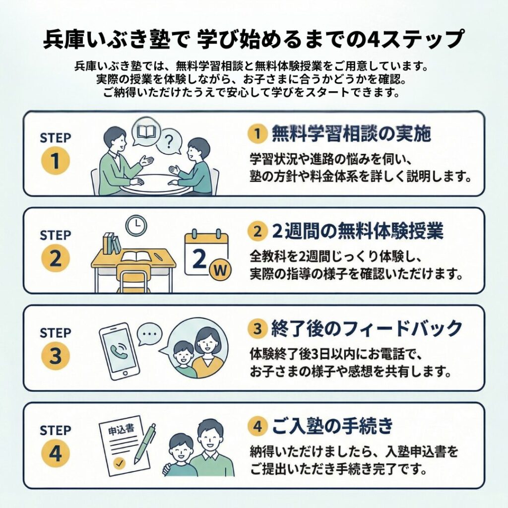 兵庫いぶき塾では、保護者の方を対象とした無料の学習相談と、実際の授業を受けられる2週間の無料体験授業を受け付けております。