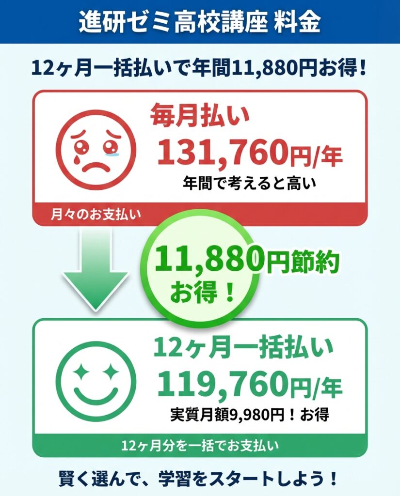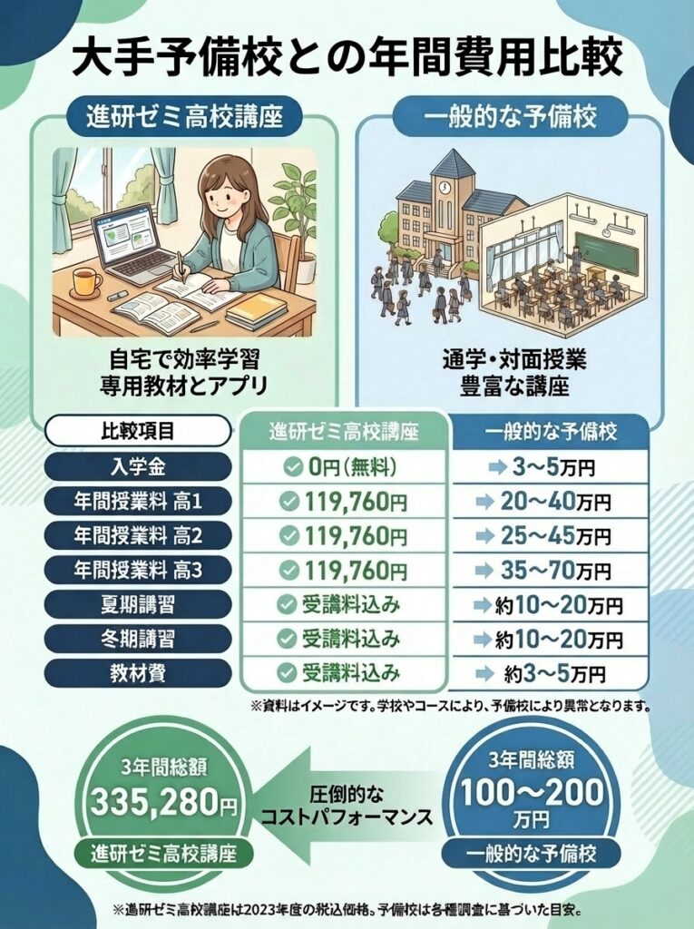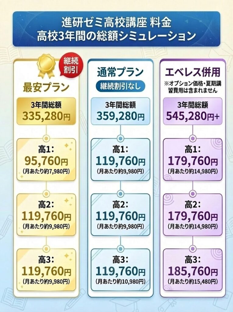 中3から継続+12ヶ月一括払いを活用すると、高校3年間で合計335,280円で受講できます。