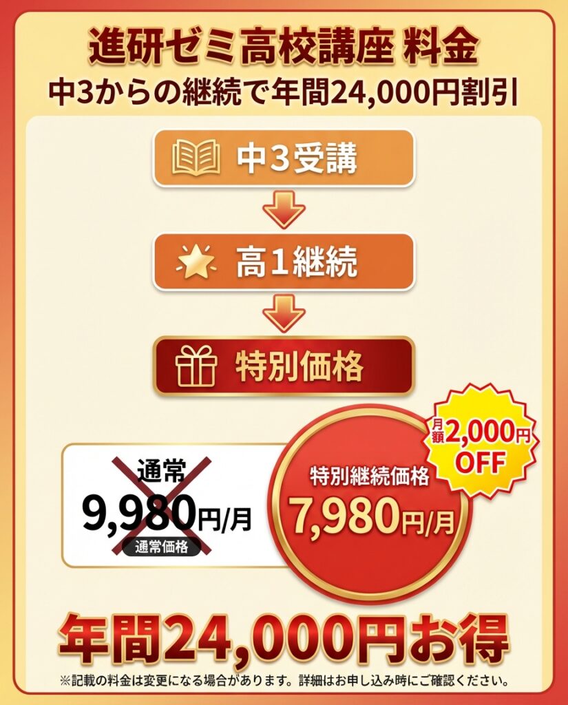 中3の3月号まで受講して高1に継続すると、進研ゼミ高校講座の1年間が月額2,000円割引になります。