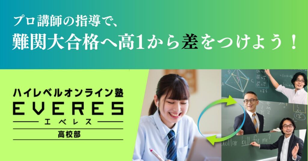 EVERES(エベレス)は、ベネッセコーポレーションが提供する、難関高校・難関大学を目指す中学生・高校生向けのハイレベルなオンライン塾です。プロ講師による生配信のライブ授業や、双方向のチャット質問機能、独自カリキュラムが特徴で、自宅にいながら効率的に受験力を鍛えられます。