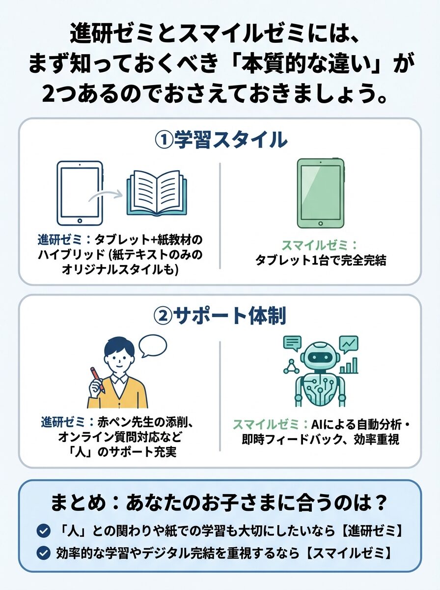 進研ゼミとスマイルゼミを選ぶ前に、まず知っておくべき「本質的な違い」が2つあるのでおさえておきましょう。